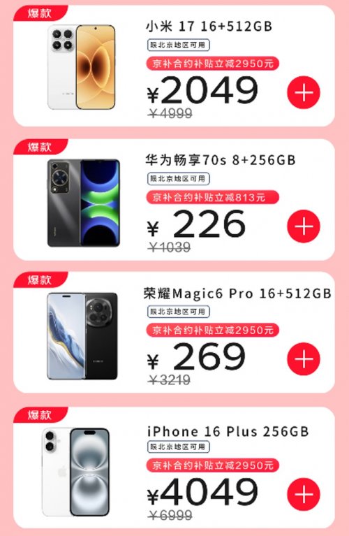 北京地區(qū)的用戶(hù)若想通過(guò)京補(bǔ)合約購(gòu)買(mǎi)iPhone系列手機(jī),同樣能享受到諸多優(yōu)惠。其中,購(gòu)買(mǎi)iPhone 16 Plus 256GB,可享京補(bǔ)合約補(bǔ)貼立減2950元,到手價(jià)只需4049元。除了iPhone,北京地區(qū)用戶(hù)在京東購(gòu)買(mǎi)256G版本的小米 17時(shí),通過(guò)京東補(bǔ)合約購(gòu)買(mǎi),可享補(bǔ)貼立減2950元,到手價(jià)僅為2049元;購(gòu)買(mǎi)華為暢享70S 256G,可享補(bǔ)貼立減813元,到手價(jià)僅需226元;購(gòu)買(mǎi)512G版本的榮耀Magic 6 Pro,可享補(bǔ)貼立減2950元,到手價(jià)僅需269元。
