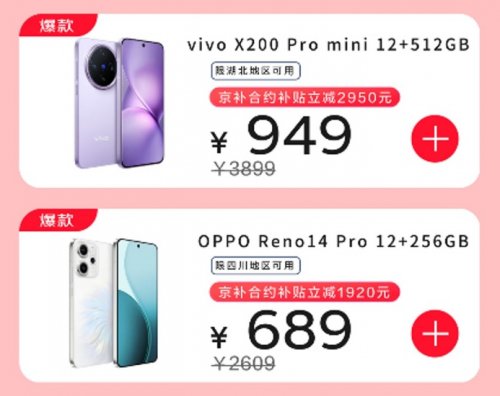 其他地區(qū)也有相應(yīng)的福利。湖北地區(qū)用戶(hù)購(gòu)買(mǎi)512G版本的vivo X200 Pro mini,可享京補(bǔ)合約補(bǔ)貼立減2950元,到手價(jià)949元;四川地區(qū)用戶(hù)購(gòu)買(mǎi)256G版本的OPPO Reno 14 Pro,京補(bǔ)合約補(bǔ)貼立減1920元,到手價(jià)689元。
