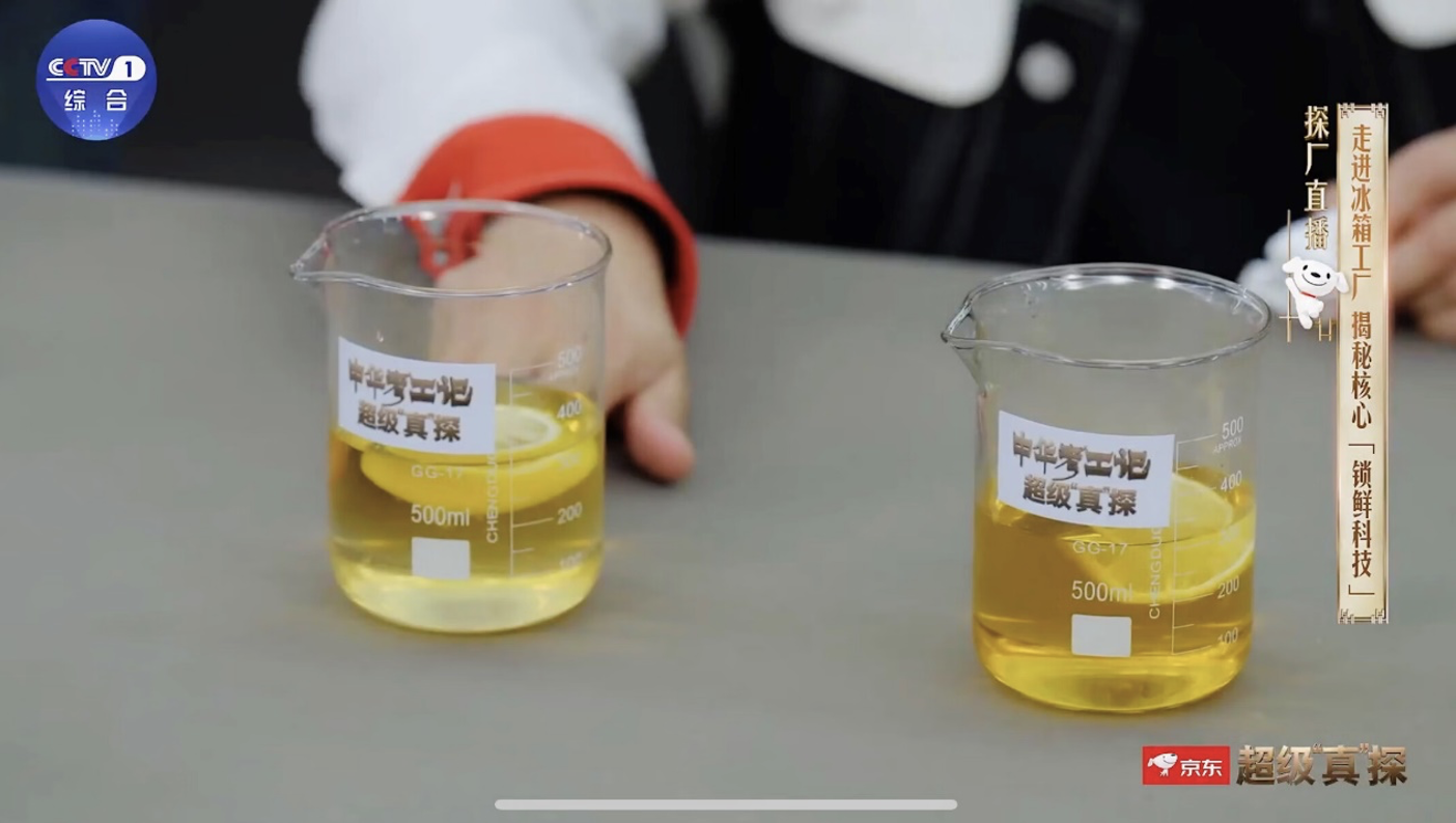 節(jié)目中,主持人和京東采銷現(xiàn)場進(jìn)行了實驗,放在卡薩帝冰箱7天的檸檬,VC流失少,能和碘伏反應(yīng)讓碘伏迅速變透明,而放在老式冰箱中的檸檬幾乎沒有對碘伏的還原性。通過降氧增氮,這款京東與卡薩帝獨家共建的“明星”冰箱實現(xiàn)了8倍保鮮力。
