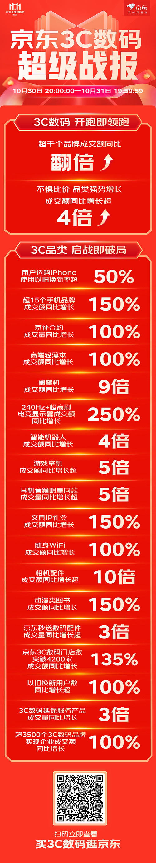 眾多消費者到京東11.11換新手機,近24小時,超15個手機品牌成交額同比增長超150%,50%用戶使用以舊換新選購iPhone。同時,各類3C數(shù)碼趨勢品類增長顯著,智能機器人成交額同比增長4倍,高端輕薄本、隨身WiFi同比增長100%,小平板、相機配件同比增長10倍,240Hz+超高刷電競顯示器同比增長250%,閨蜜機同比增長9倍,游戲掌機同比增長超5倍,激光打印機同比增長130%,文具IP禮盒、動漫類圖書同比增長150%,京補合約成交量同比增長100%,耳機音箱明星同款成交量同比增長超5倍。