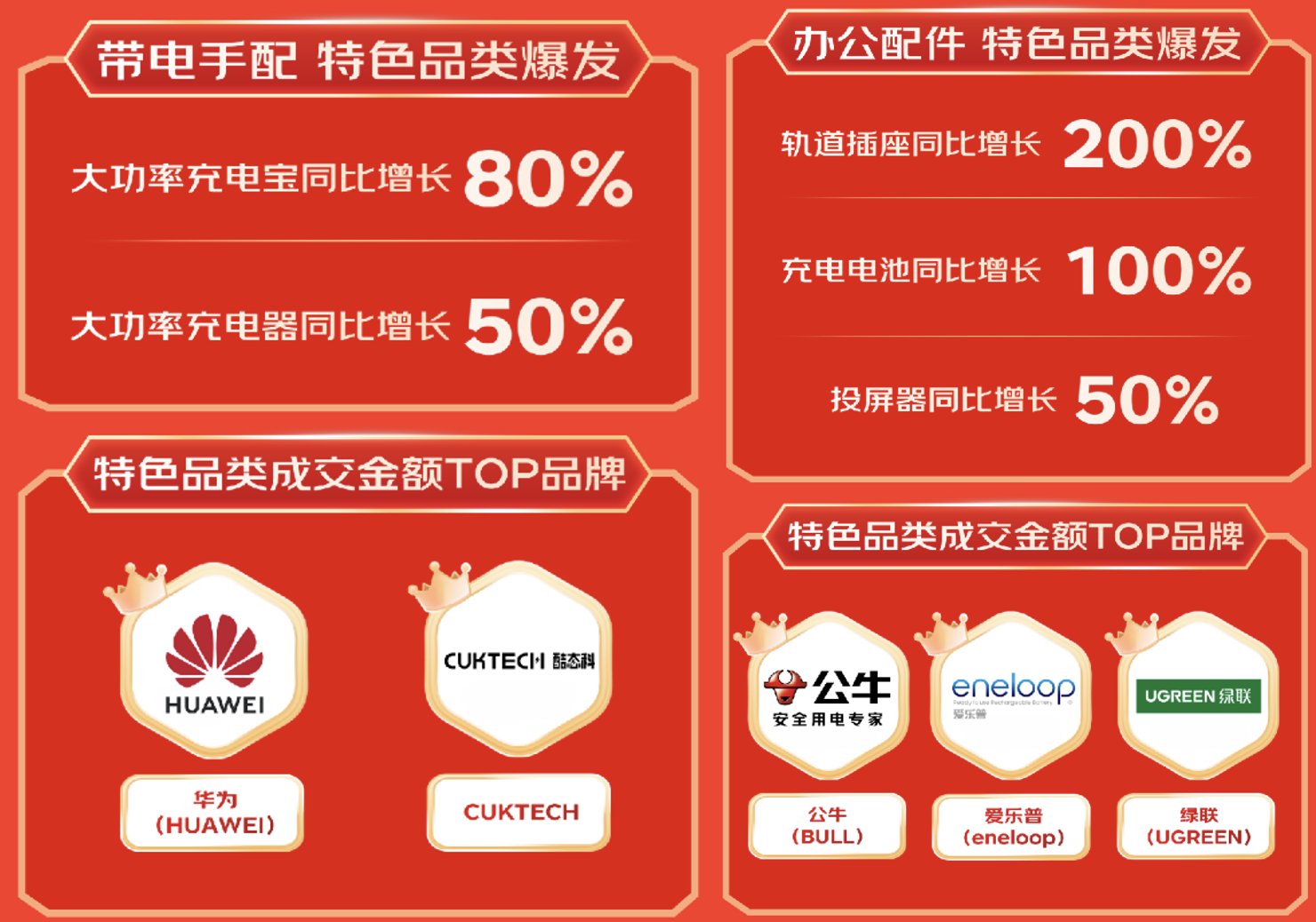 在特色品類方面,各領(lǐng)域都呈現(xiàn)出蓬勃的發(fā)展態(tài)勢(shì)。帶電手配特色品類中,大功率充電寶同比增長(zhǎng)80%,大功率充電器同比增長(zhǎng)50%,滿足了消費(fèi)者在不同場(chǎng)景下對(duì)設(shè)備充電的多樣化需求。辦公配件特色品類迎來爆發(fā)式增長(zhǎng),軌道插座同比增長(zhǎng)200%,為辦公環(huán)境的電力供應(yīng)提供穩(wěn)定保障;充電電池同比增長(zhǎng)100%,投屏器同比增長(zhǎng)50%,公牛、eneloop、綠聯(lián)等品牌憑借出色的產(chǎn)品品質(zhì),在成交金額上名列前茅,助力消費(fèi)者提升辦公效率。