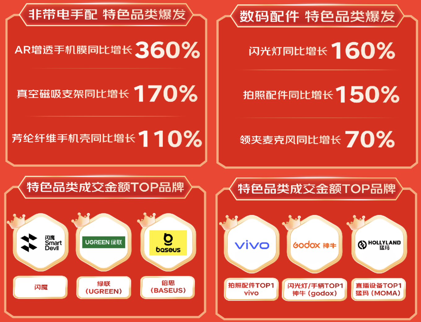 非帶電手配特色品類同樣增長(zhǎng)迅猛。AR增透手機(jī)膜同比增長(zhǎng)360%,讓手機(jī)屏幕顯示更加清晰;真空磁吸支架同比增長(zhǎng)170%,為手機(jī)使用提供便捷支撐;芳綸纖維手機(jī)殼同比增長(zhǎng)110%,閃魔、綠聯(lián)、倍思等品牌為消費(fèi)者提供了個(gè)性化、高品質(zhì)的選擇。數(shù)碼配件特色品類中,閃光燈同比增長(zhǎng)160%,拍照配件同比增長(zhǎng)150%,領(lǐng)夾麥克風(fēng)同比增長(zhǎng)70%,vivo、godox神牛、HOLLYLAND等品牌占據(jù)優(yōu)勢(shì)地位,滿足了攝影愛好者和內(nèi)容創(chuàng)作者的需求。