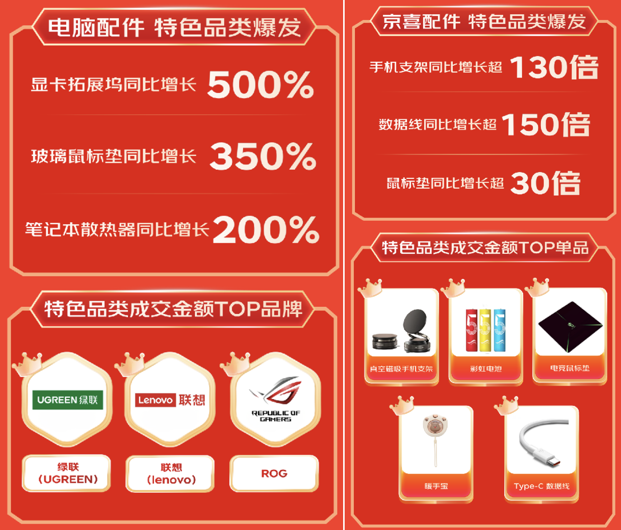 電腦配件特色品類表現(xiàn)也十分亮眼,顯卡拓展塢同比增長(zhǎng)500%,為電腦性能提升提供有力支持;玻璃鼠標(biāo)墊同比增長(zhǎng)350%,筆記本散熱器同比增長(zhǎng)200%,綠聯(lián)、聯(lián)想、ROG等品牌備受消費(fèi)者青睞。而京喜配件特色品類更是異軍突起,手機(jī)支架同比增長(zhǎng)超130倍,數(shù)據(jù)線同比增長(zhǎng)超150倍,鼠標(biāo)墊同比增長(zhǎng)超30倍,展現(xiàn)出強(qiáng)勁的市場(chǎng)競(jìng)爭(zhēng)力。