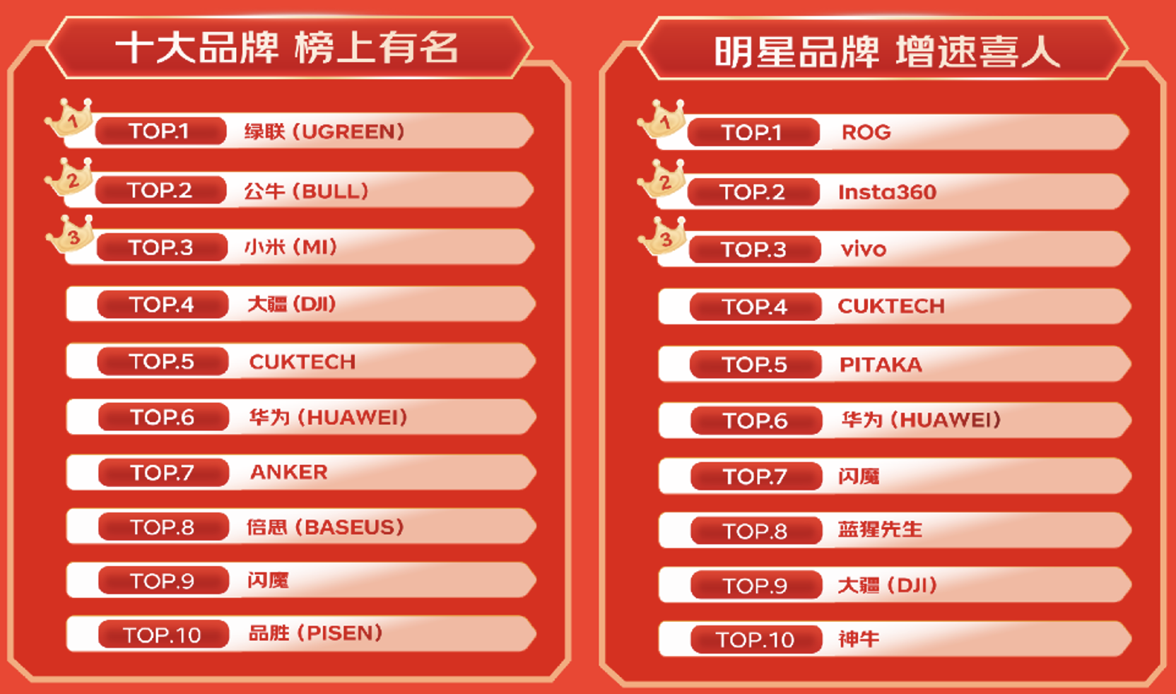 品牌層面,綠聯(lián)(UGREEN)憑借其豐富的產(chǎn)品線、卓越的產(chǎn)品品質(zhì)和廣泛的市場(chǎng)認(rèn)可,位居3C配件品類榜首。公牛(BULL)、小米(MI)、大疆(DJI)、CUKTECH、華為(HUAWEI)、ANKER、倍思(BASEUS)、閃魔、品勝(PISEN)等品牌也憑借各自的優(yōu)勢(shì)成功上榜,成為消費(fèi)者信賴的選擇。明星品牌方面,ROG以出色的性能和創(chuàng)新設(shè)計(jì)位居增速榜首,Insta360、vivo、CUKTECH、PITAKA、華為(HUAWEI)、閃魔、藍(lán)猩先生、大疆(DJI)、神牛等品牌也表現(xiàn)亮眼,增速喜人,為市場(chǎng)注入了新的活力。