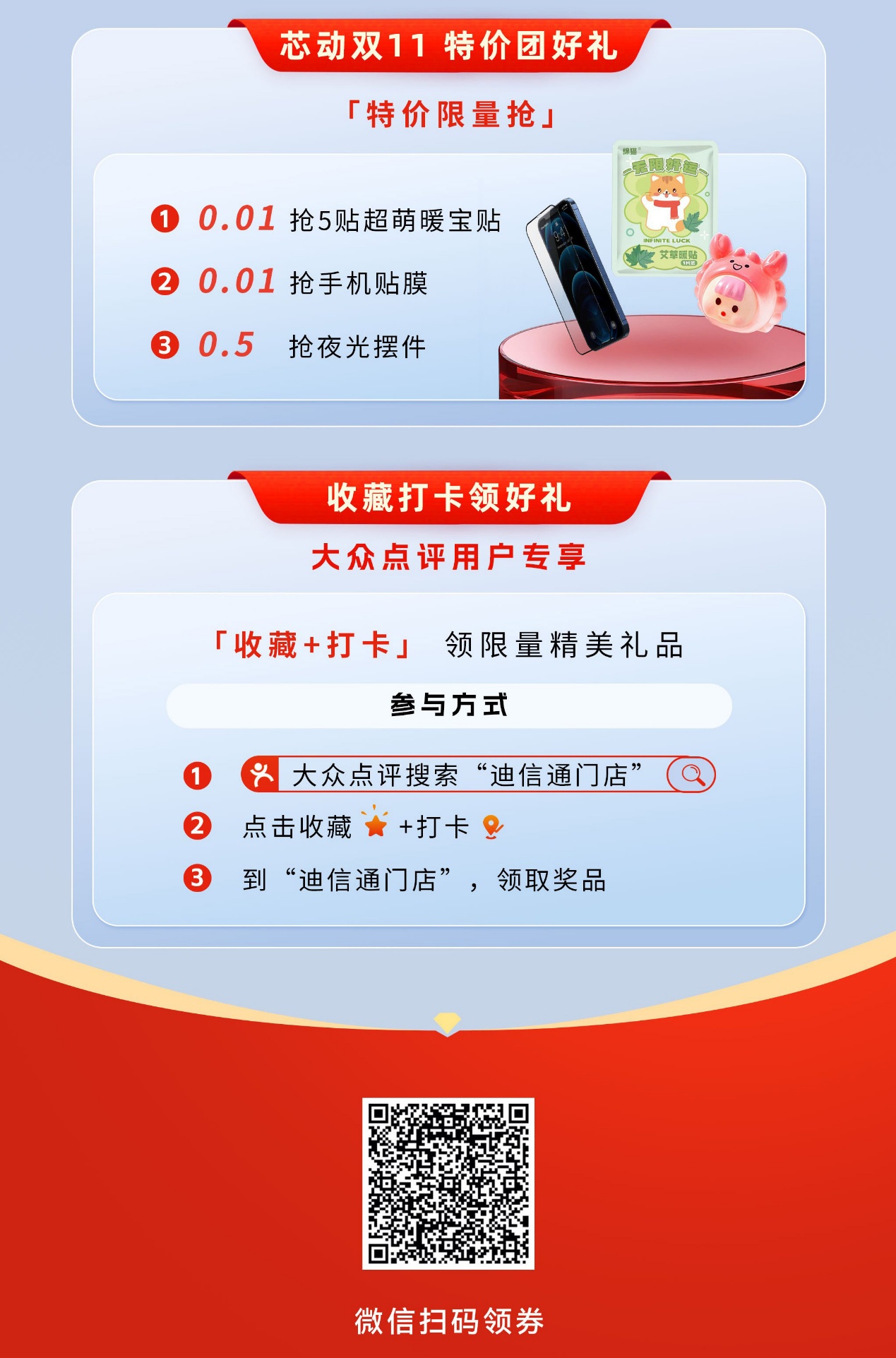最后,迪信通“芯動雙十一,新機換機潮”雙十一促銷活動正在全國火熱進行中。國補、銀行分期補、店補疊加,至高立減40%;上美團/大眾點評搶760元神券,購機直接減減減;多重權(quán)益保駕護航,讓你購機無憂;多款熱銷手機與智能數(shù)碼產(chǎn)品參與活動,價格誘人。這個雙十一,快來迪信通選購心儀的數(shù)碼裝備,享受超值優(yōu)惠與貼心服務(wù),用科技好物點亮品質(zhì)生活!
