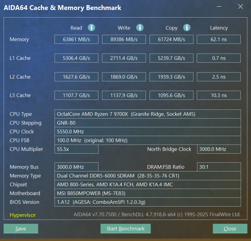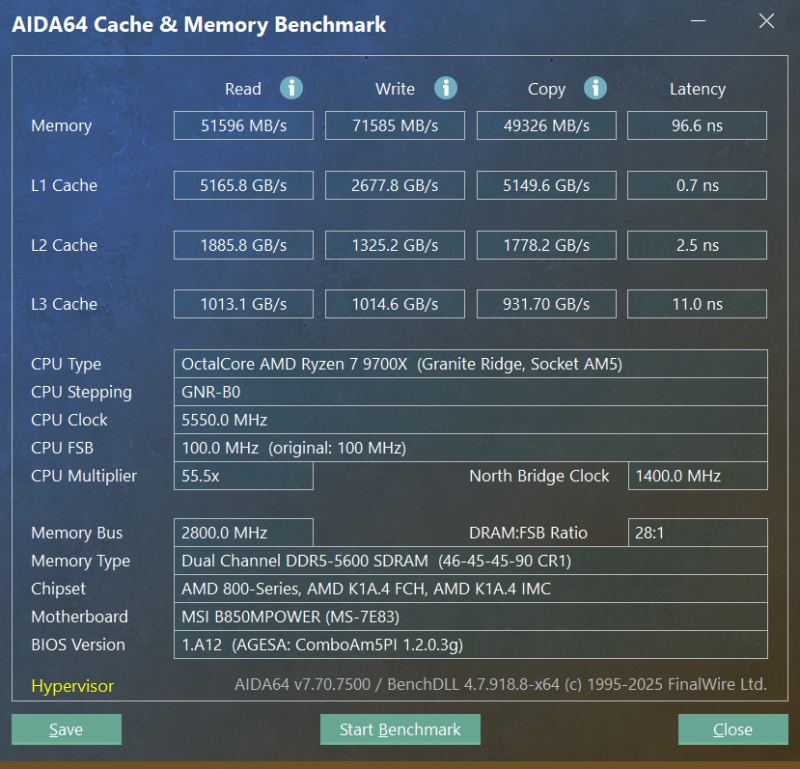 默認(rèn)狀態(tài)下進(jìn)行AIDA64內(nèi)存跑分測試,云礪DDR5讀取速度為51596 MB/s、寫入71585 MB/s、拷貝49326 MB/s、延遲96.6 ns。表現(xiàn)中規(guī)中矩,延遲略高。