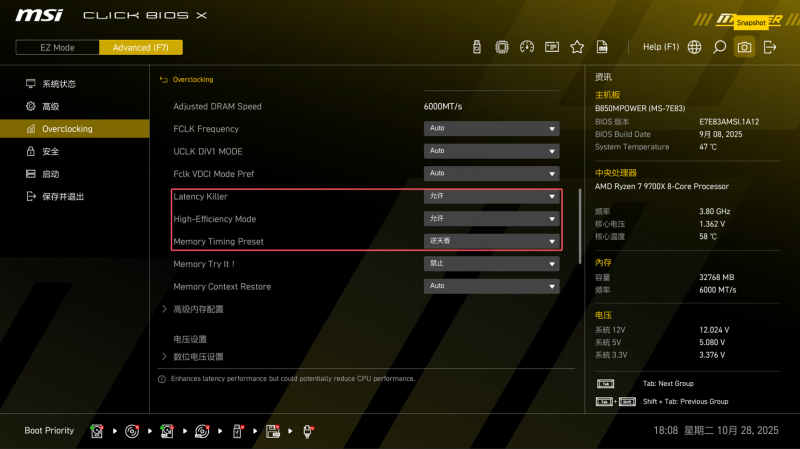 既然是專門為超頻打造的CP組合,這個程度當(dāng)然不是全部實力。別著急,還有大招沒放!再次重啟電腦進(jìn)入BIOS后,打開“延遲殺手”和高效能模式“逆天香”預(yù)設(shè),主板自動完成所有的參數(shù)優(yōu)化!