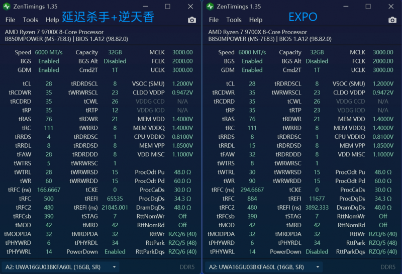 從ZenTimings中可以看到,多項小參對比只開啟EXPO時有了明顯縮緊。像TREFI和TRFC這兩個最近熱門的“邪修”超頻設(shè)置,它直接一步到位。