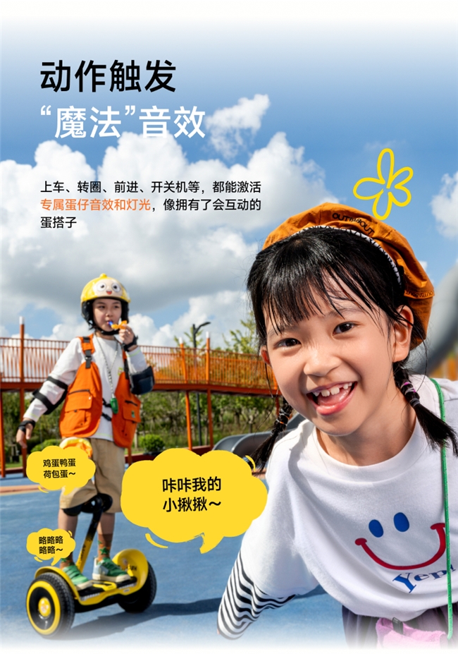 騎行過程中還能和平衡車產生互動,上車、轉圈、前進、開關機等操作都能激活專屬蛋仔音效和燈光,聽著:“雞蛋鴨蛋荷包蛋”、“咔咔我的小啾啾”等熟悉的音效,如同有一個蛋仔陪著小朋友一起騎行。