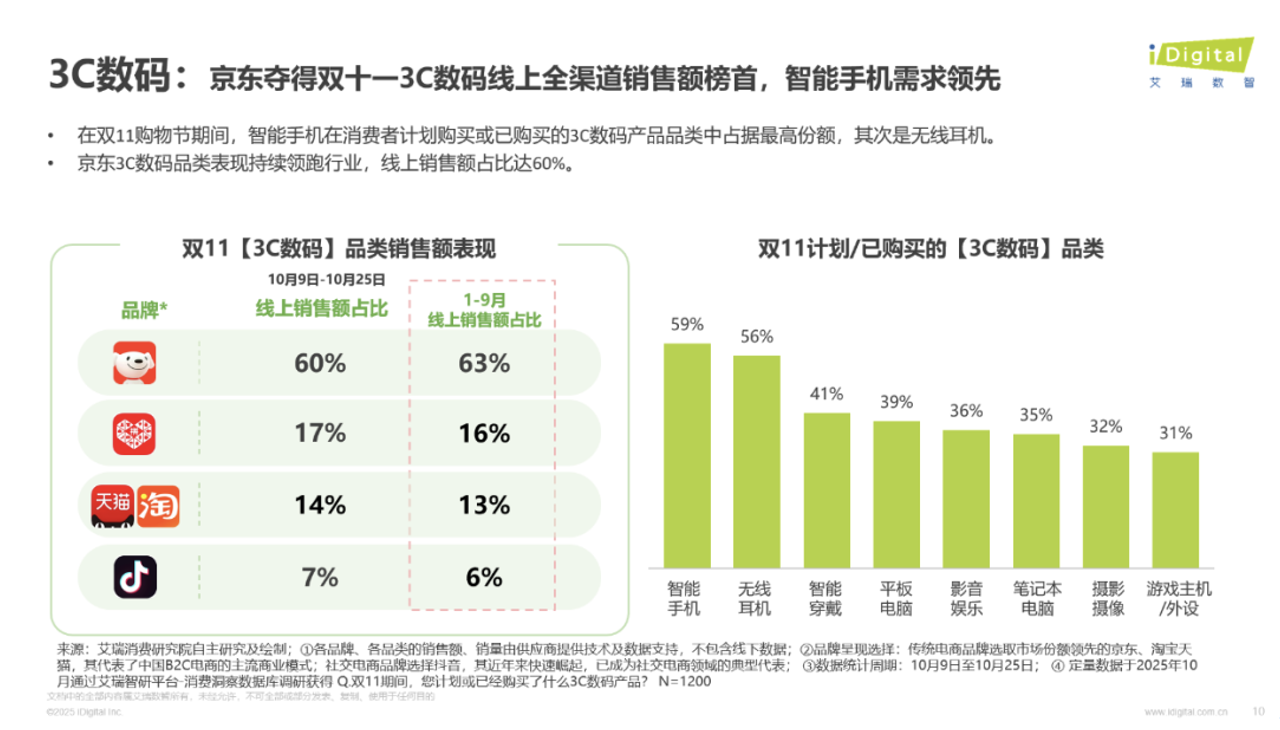 今年11.11,從頭部平臺運營表現(xiàn)觀察,京東依托在商品供應鏈、物流履約及客戶服務領域的積累實現(xiàn)全品類業(yè)務協(xié)同增長,其3C數(shù)碼品類持續(xù)保持市場領先地位。