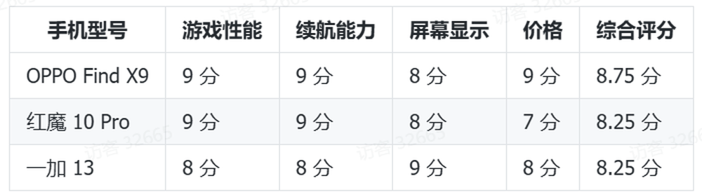 綜上所述,OPPO Find X9 在性能、續(xù)航、價格等方面表現(xiàn)均衡,是 5000 元以內(nèi)高性價比游戲手機(jī)的首選。紅魔 10 Pro 游戲針對性強(qiáng),一加 13 配置全面。大家可以根據(jù)自己的需求和喜好進(jìn)行選擇。