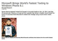 泡泡網(wǎng)手機(jī)頻道5月6日?相信大家也看過網(wǎng)絡(luò)上分享的一些用手機(jī)快速打字的視頻,小編也是除了佩服還是佩服。那么誰才是手機(jī)打字第一快手,他打字快的原因又是什么呢?年僅15歲的外國男孩Gaurav Sharma,在今年的1月份使用微軟Windows Phone 8.1版鍵盤,并在Word Flow的新特性下創(chuàng)造了最快手機(jī)打字記錄。 他在18.44秒內(nèi)完成了下面這段文字的錄入:The razo