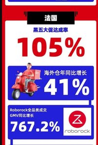 全球速賣通的數(shù)據(jù)顯示,速賣通法國黑五大促達(dá)成率為105%%,海外倉年同比增長(zhǎng)41%%,其中的石頭科技旗下品牌Roborock全品類成交GMV同比增長(zhǎng)767.2%% 。