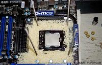 ????泡泡網(wǎng)主板頻道9月13日?很多喜歡超頻的玩家都知道,用液氮進(jìn)行超頻時(shí),都需要在處理器上安放一個(gè)純銅的“大炮”,液氮倒入進(jìn)“大炮”內(nèi)來吸收處理器產(chǎn)生的熱量,不過,由于液氮溫度過低,會(huì)使周圍空氣中的水氣凝固成液體(冷凝水),從而會(huì)有很多的水珠落在主板處理器供電的周圍,如果不及時(shí)處理掉,主板電路就會(huì)由于水的浸泡很出現(xiàn)損壞,尤其是在超頻時(shí),整個(gè)主板都在通電運(yùn)行。 ??? 為了解決這一問題,