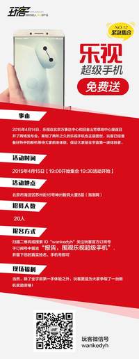 ??? 2015年4月14日,樂(lè)視在北京萬(wàn)事達(dá)中心和舊金山芳草地中心接連召開(kāi)了兩場(chǎng)發(fā)布會(huì),籌劃了兩年之久的樂(lè)視手機(jī)也正是面世,玩客已經(jīng)準(zhǔn)備好熱乎的新機(jī)等待大家前來(lái)體驗(yàn),保證大家是全宇宙第一波體驗(yàn)者,那么少年,約么???? 《玩客》一個(gè)愛(ài)好聚合及關(guān)注科技產(chǎn)品體驗(yàn)的平臺(tái) 在這里大家除了可以通過(guò)“達(dá)人秀”找到志趣相投的朋友,還可以欣賞并隨時(shí)參與到時(shí)尚的“街拍”活動(dòng)中,另外“主題活動(dòng)”、“緊急集合”及