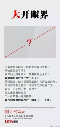 ??? 今日下午樂視員工在朋友圈曝光了一張“大開眼界”為主題的發(fā)布會(huì)宣傳圖?!半娪捌痹絹碓劫F、引領(lǐng)行業(yè)進(jìn)入大屏生態(tài)時(shí)代”等宣傳語揭露著樂視將突破現(xiàn)有Max70的屏幕尺寸,而且還要朝向影院級規(guī)格發(fā)展,結(jié)合業(yè)界現(xiàn)狀來看,樂視很有可能將在10月27日的發(fā)布會(huì)上公布微投或者是超短焦微型投影產(chǎn)品。在引導(dǎo)了智能電視革命之后,這次又要領(lǐng)先于其他品牌推出投影級產(chǎn)品了,樂視的大屏產(chǎn)品生態(tài)也將更為完善。??? 根據(jù)我