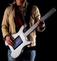 ??? 玩著《Guitar Hero》的仿真吉他是不是已經(jīng)讓您覺(jué)得很High了呢?看看下面的這款數(shù)碼電吉他,相信一定會(huì)給您帶來(lái)更與眾不同的感受。作為一名曾經(jīng)的吉他愛(ài)好者,編輯本人看到這張圖片的時(shí)候無(wú)比興奮,并深深感受到了科技與想象力的結(jié)合竟能如此令人震撼。 ??? 這款名為Kitara的電吉他(售價(jià)850美元)由三個(gè)部分組成:一個(gè)完整的指板、一個(gè)8英寸的多點(diǎn)觸摸屏以及一個(gè)內(nèi)建和鉉功能