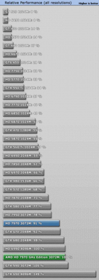 ????泡泡網(wǎng)顯卡頻道6月28日?Radeon HD 7970 GHz Edition正式發(fā)布了。權威評測表明,它和GeForce GTX 680可以說是不相上下,游戲性能互有勝負,誰都沒有必勝的把握,綜合下來AMD只領先一兩個百分點。對于多年來遠離單芯旗艦寶座、此番僅憑超頻版反擊的AMD來說,這其實已經(jīng)算是不容易了。 ??? AMD曾經(jīng)解釋說,Radeon HD 7970 GHz Edit