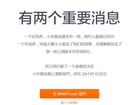 ????泡泡網(wǎng)手機(jī)頻道11月28日?今天凌晨正當(dāng)小編找有價(jià)值行情之時(shí),突然看到小米官網(wǎng)上這樣一條消息。首先看到了是“好消息”,小米路由器首發(fā)預(yù)約超過50萬(wàn),而“壞消息”是公測(cè)版僅有500臺(tái)。這……看到這消息,確實(shí)如當(dāng)頭一棒。 >>或預(yù)約或圍觀:小米路由器預(yù)約 [點(diǎn)擊進(jìn)入] 目前小米官方?jīng)Q定將于24小時(shí)內(nèi)關(guān)閉小米路由器公測(cè)版的預(yù)約通道,就小編發(fā)稿時(shí)還有不到20個(gè)小時(shí)的時(shí)間。