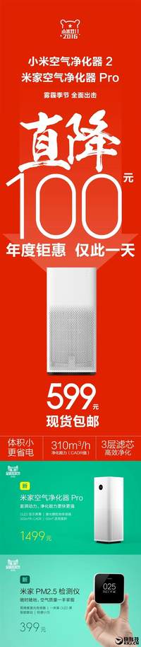 馬上就是雙11了,同時(shí)也是霧霾多發(fā)的季節(jié) 。所以,空氣凈化器應(yīng)該會(huì)是熱賣的產(chǎn)品?! ∪涨?,小米宣布,在雙11當(dāng)天對(duì)小米空氣凈化器降價(jià)促銷,原價(jià)699元的小米空氣凈化器2在小米天貓旗艦店直降100元銷售,599元現(xiàn)貨包郵?! 〈送?,在雙11當(dāng)天,剛剛發(fā)布的米家空氣凈化器Pro也將正式開賣,其售價(jià)為1499元,凈化能力遠(yuǎn)高于小米空氣凈化器2?! ×硪豢钚缕访准襊M2.5檢測(cè)儀也將同時(shí)開賣,售價(jià)39