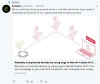 據(jù)外媒報(bào)道,1月18日Embedi安全研究人員Denis Selianin發(fā)現(xiàn)了一個(gè)漏洞,該漏洞影響了部署在各種設(shè)備(如筆記本電腦,智能手機(jī),游戲設(shè)備,路由器和物聯(lián)網(wǎng)設(shè)備)中的流行Wi-Fi芯片組的固件。根據(jù)Selianin的說法,這個(gè)漏洞會(huì)影響ThreadX,這是一個(gè)實(shí)時(shí)操作系統(tǒng),可用作數(shù)十億設(shè)備的固件。