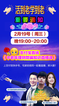 2月19日消息,支付寶在微博宣布,將于今晚19點至20點在快手上舉行首場《中老年理財防騙知識直播課》,呼吁大家速速轉(zhuǎn)到相親相愛一家人群。