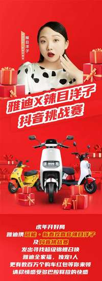 超能力開場,為新年冠能!1月10日,全球兩輪電動車第一品牌雅迪攜手“冠能·新春歡喜官”辣目洋子及抖音挑戰(zhàn)賽發(fā)起#超級錦鯉大獎#新春重磅福利活動,寵粉活動再升級。全網(wǎng)尋找雅迪“超級錦鯉”,壕氣贈送雅迪電動車“全家?!?,并以一系列優(yōu)惠換購活動助力用戶新年換新車,開啟一場福利多多、歡樂滿滿的新春“冠能”之旅!