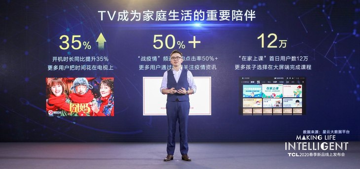 此次發(fā)布會正值肺炎疫情期間,這場突如其來的戰(zhàn)“疫”,不僅打亂了我們所有人的生活節(jié)奏,也悄無聲息的改變了大家的生活方式,比如春節(jié)期間許多人會選擇通過視頻通話拜年以及用電視上的攝像頭拍攝全家福,還有在線追劇看電影等等,而TV無疑成為了家庭生活的重要陪伴。