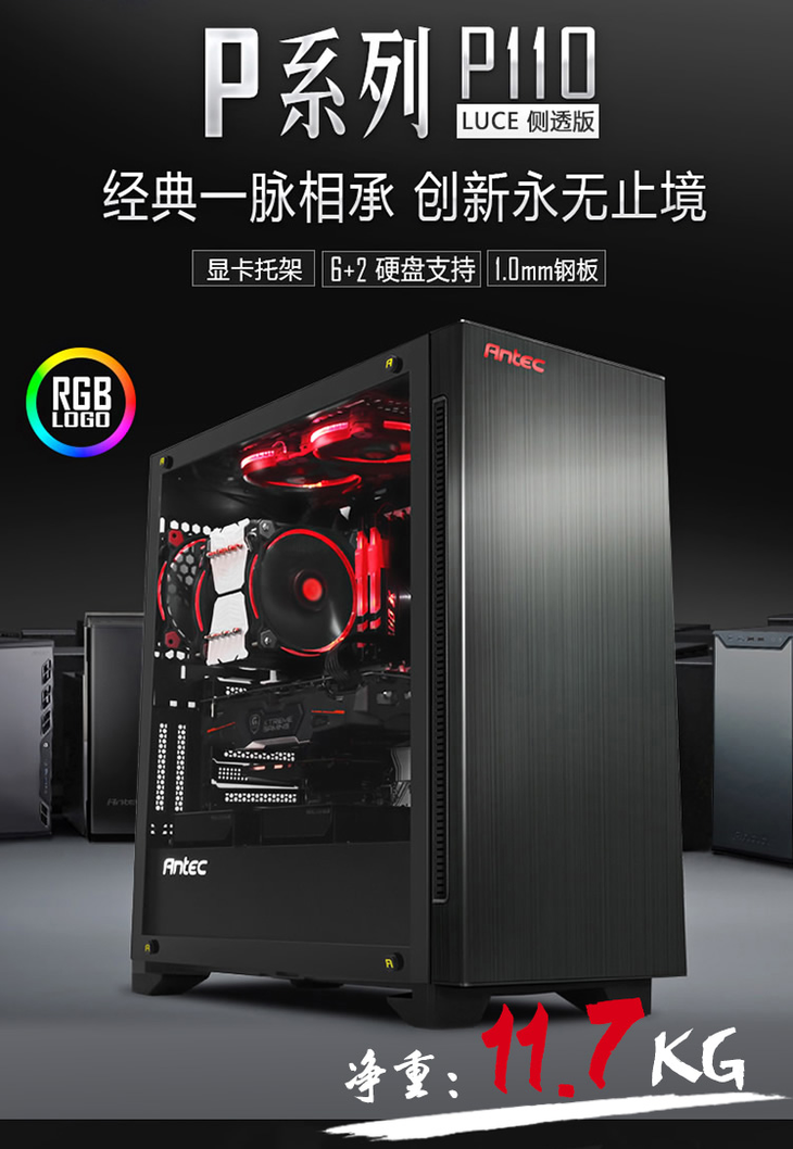安鈦克P110側(cè)透版機(jī)箱延續(xù)了P系列機(jī)箱的經(jīng)典設(shè)計,整體外觀造型偏簡潔風(fēng)。機(jī)箱前面板僅有左上角會發(fā)光Antec LOGO,非常簡潔。這個LOGO支持7色變換,為機(jī)箱增添了一份個性。金屬前面板采用了陽極氧化拉絲工藝,擁有更好的質(zhì)感。機(jī)箱的側(cè)面為大側(cè)透設(shè)計,使用了4mm厚度的鋼化玻璃,在保證強(qiáng)度的同時也能更加完美地展示機(jī)箱內(nèi)部的燈光效果。這款機(jī)箱擁有較好的擴(kuò)展性,最高支持ATX主板。除了機(jī)箱左側(cè)8條常規(guī)的PCI插槽外,機(jī)箱還擁有2條垂直的PCI插槽,能提供更多的顯卡安裝方案,裝機(jī)更方便。此外,這款機(jī)箱的顯卡托架能為重裝顯卡提供更加穩(wěn)固的支撐,長時間使用也不會出現(xiàn)顯卡插口變形等問題。這款機(jī)箱可以安裝多種規(guī)格的冷排或不同尺寸的風(fēng)扇散熱,輕松解決散熱上的問題。在機(jī)箱多處也配備有易拆洗的防塵網(wǎng),清潔起來更省心。在機(jī)箱的I/O區(qū)域,除了常規(guī)的開機(jī)鍵、USB接口、音頻接口外,還擁有一個燈光控制按鍵和一個HDMI視頻接口,玩家使用VR設(shè)備時更加方便。