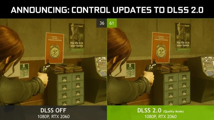 ?。ㄉ蠄D為光追大作《控制》游戲在使用新DLSS 2.0保持變量的幀數(shù)及畫質(zhì)對比)