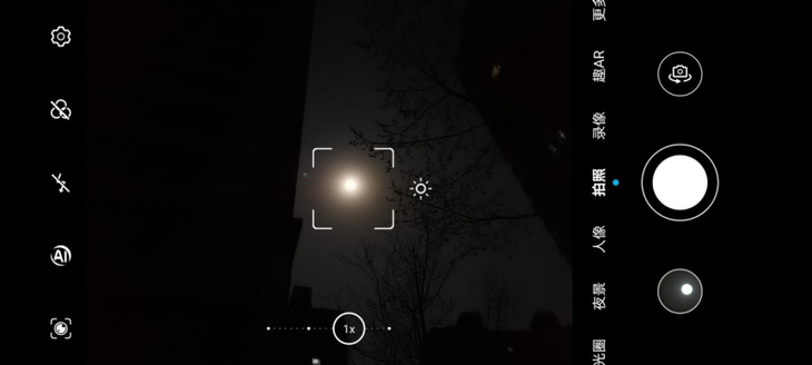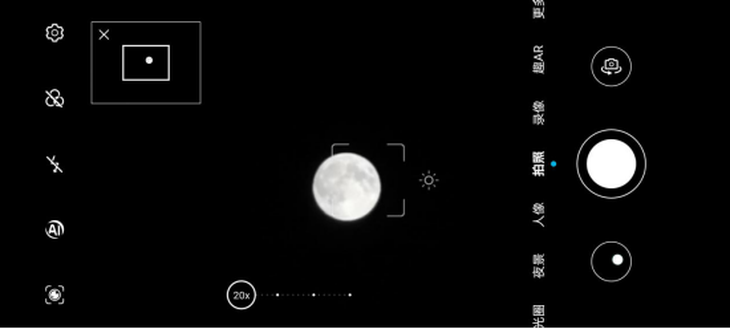 有了長焦鏡頭的加入,我們在夜晚還可以使用榮耀30S拍攝月亮,當我們使用20倍變焦的時候,手機的拍攝畫面中會出現(xiàn)一個畫中畫,并且在畫面中能夠實時顯示長焦時所拍攝的位置,能夠快速的找準月亮的位置,非常的貼心和方便。