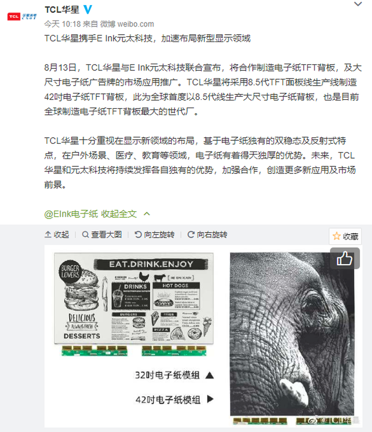 8月13日,TCL華星官方發(fā)布消息, TCL華星將與E Ink元太科技合作制造電子紙TFT背板,及大尺寸電子紙廣告牌的市場應(yīng)用推廣。