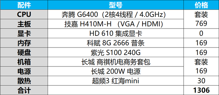 主板搭配的是技嘉的入門型號H410M-H,3+1相供電應付雙核處理器還是不成問題的,提供了2個USB 3.0、4個USB 2.0以及HDMI+VGA視頻接口,方便兼容一些較老的VGA顯示器,如果現(xiàn)在用的顯示器只有DVI接口,那么也可以換成價格相近的H410M-DS2V。