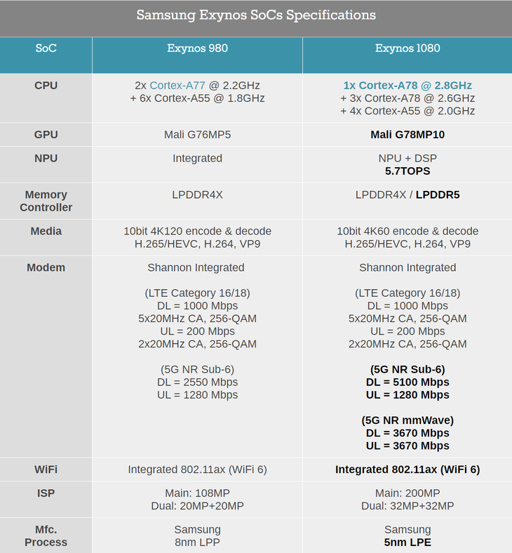 根據(jù)AnandTech整理的表格可以看出,三星Exynos 1080是三星首款5nm工藝的旗艦soc;它還在業(yè)內(nèi)首發(fā)了ARM最新的Cortex-A78架構(gòu),大核頻率高達2.8GHz;GPU也從上代的5核G76升級為10核G78。從規(guī)格就可以預(yù)見,其性能對比前代的Exynos 980將獲得巨大幅度的提升。