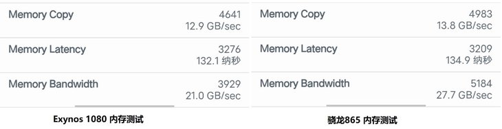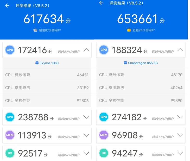 在安兔兔V8.5.2測試中,Exynos 1080獲得約61.7萬分,確實十分接近于驍龍865的65.3萬分,二者的差距主要體現(xiàn)在GPU上,但也幾乎可以說是同級別的性能水準。