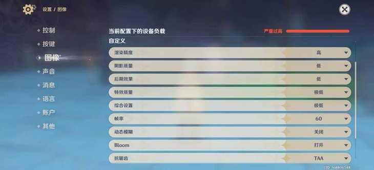 原神是一款多平臺游戲,對手機性能要求極為苛刻。由于在任何一款手機上運行《原神》都分辨率都會被限制到最高720P,所以筆者推薦采用如下設(shè)置,優(yōu)先開啟渲染精度和抗鋸齒,其它為最低或關(guān)閉,畢竟分辨率不夠再華麗的特效也是糊成一片。本次測試也采用該設(shè)置進行。