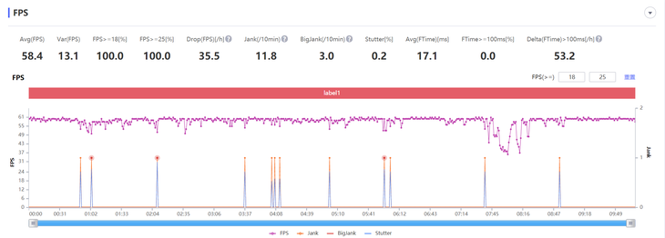 我們選取較為復(fù)雜的“蒙德城”場景進行10分鐘的幀率記錄,最終三星Exynos 1080仍舊取得了與驍龍865旗鼓相當?shù)谋憩F(xiàn)??梢哉f三星這款新的soc在游戲優(yōu)化上應(yīng)該是比較到位的,實際表現(xiàn)基本符合理論測試的水準。