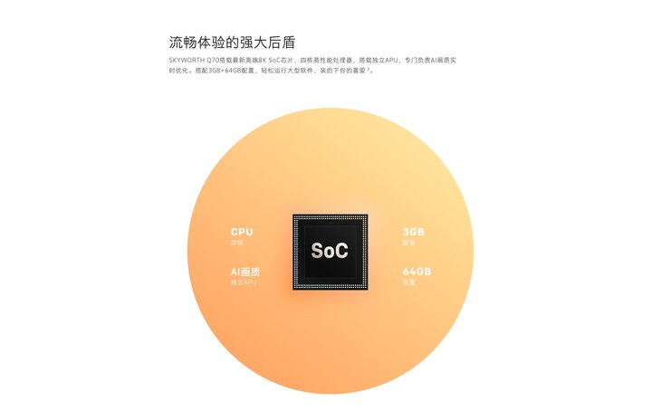 創(chuàng)維Q70鳴麗屏電視搭載全新8K SoC芯片,可以滿足高清視頻解碼需求。同時配備了3GB+64GB存儲組合,不僅運行流暢,也能裝下更多的應(yīng)用。
