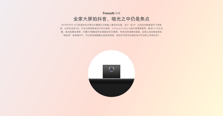 這款電視還支持特色的電視K歌功能,深度整合“唱吧”資源,讓你通過電視就能愉快K歌,帶來不一樣的樂趣。創(chuàng)維Q70鳴麗屏電視內(nèi)置了高進(jìn)光升降式AI攝像頭,通過電視內(nèi)置的智慧攝像頭,還可以實現(xiàn)視頻、體感游戲等功能。