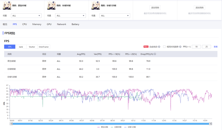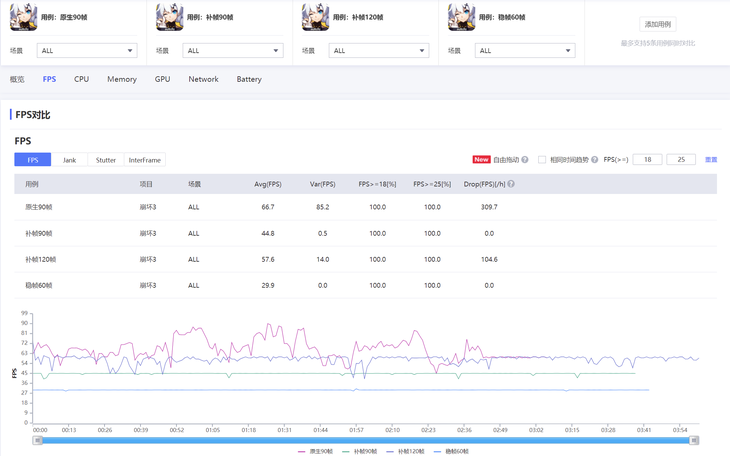 (測試選取負(fù)載較高的19-14關(guān)卡,特效全開,開啟戰(zhàn)斗場景90幀模式,再分別測試原生90幀、補(bǔ)幀90幀、補(bǔ)幀120幀,穩(wěn)幀這四種模式。)