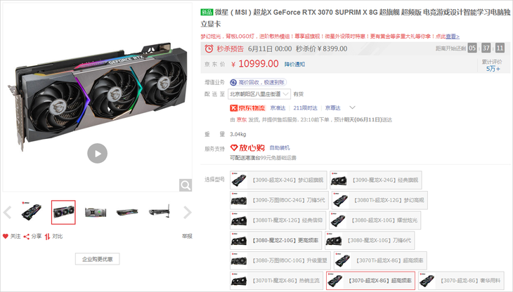 來自京東商城自營(yíng)的行情,微星RTX3070超龍顯卡將于6月11號(hào)開啟秒殺活動(dòng),當(dāng)天僅售8399元。