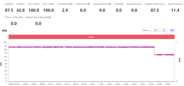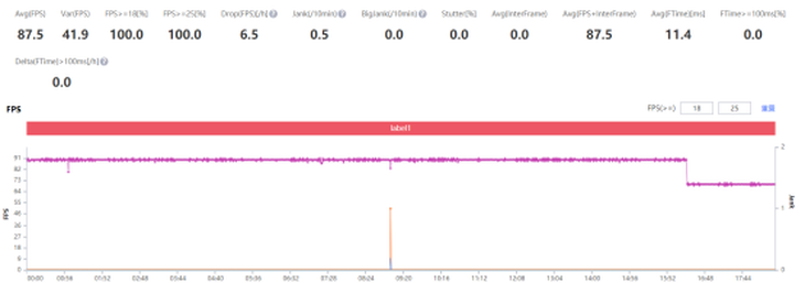 在流暢畫質(zhì)下,榮耀50 Pro運(yùn)行游戲20分鐘后的平均幀率為87.5FPS,游戲在進(jìn)行到約18分鐘時(shí)幀率降至70幀水平,此時(shí)CPU溫度為50℃。