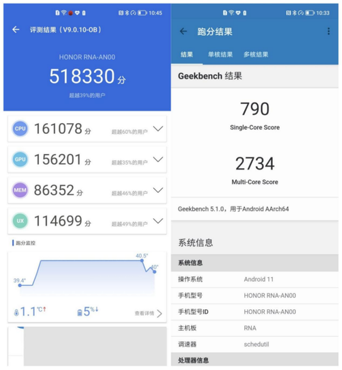 經(jīng)過測(cè)試,榮耀50 Pro的安兔兔得分為518330分,Geekbench的單核得分為790分,多核得分為2734分。