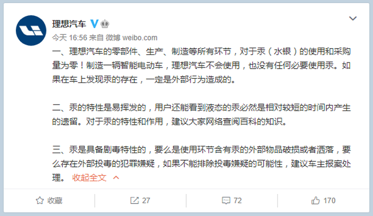 理想汽車對水銀事件做出回應(yīng):推斷系外部行為造成