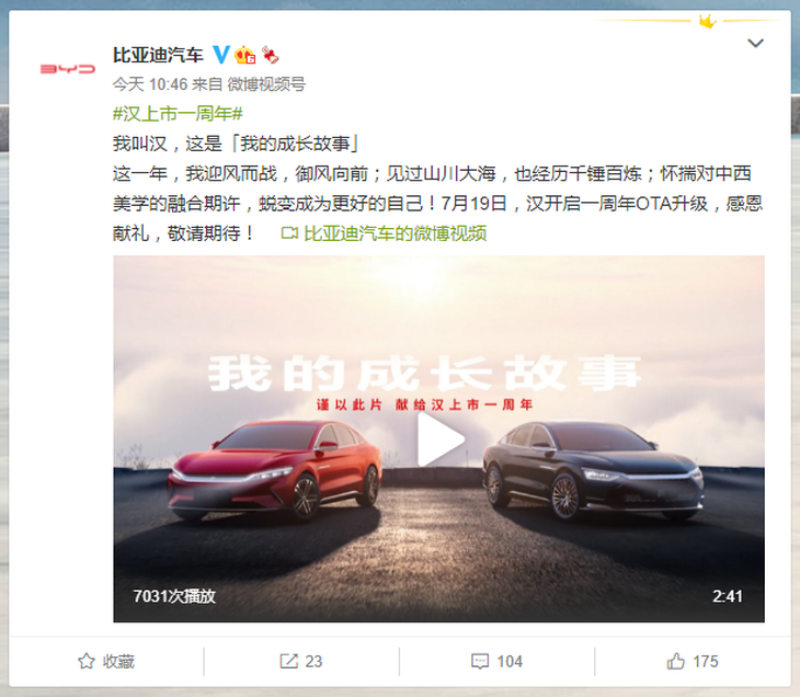 來自比亞迪官微的消息。比亞迪旗艦車型漢將于7月19號開啟一周年OTA升級。廣大漢的車主們敬請期待了!
