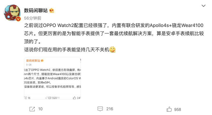 昨天,博主@數(shù)碼閑聊站也爆料OPPO Watch 2為全智能手表提供了一套最優(yōu)續(xù)航解決方案。其實(shí),他對OPPO Watch 2關(guān)注已久,5月28日就曾爆料OPPO Watch 2將搭載驍龍Wear 4100以及Apollo 4s雙芯片,并內(nèi)置ColorOS Watch和RTOS雙系統(tǒng),支持eSIM。
