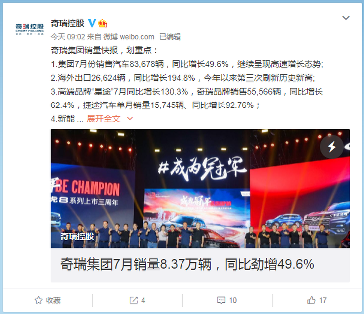 業(yè)績不錯!奇瑞7月份銷售汽車83678輛