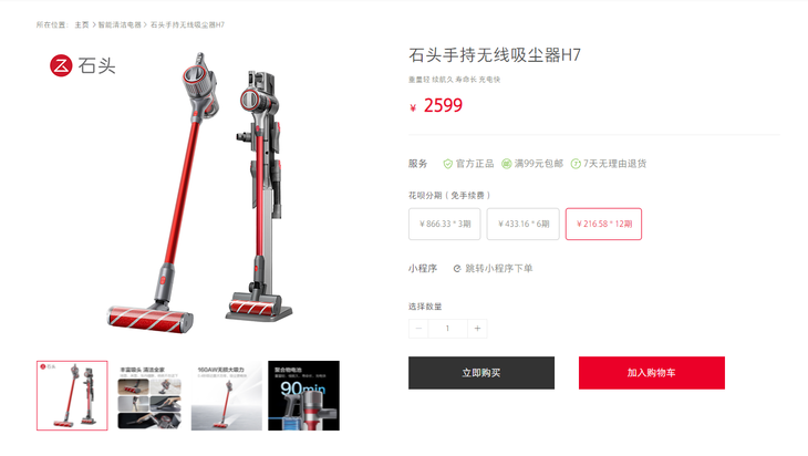 這一款產(chǎn)品可以有效覆蓋家庭清潔的各種問(wèn)題,對(duì)于邊角、高處部位都能很好地處理。而聚合物鋰電池快充、OLED 屏幕、鎖定按鈕、磁吸式配件收納等一系列優(yōu)化的加入,也體現(xiàn)了石頭科技為用戶所帶來(lái)的人性化產(chǎn)品思考,讓科技為更多人打造美好生活?,F(xiàn)階段,石頭手持無(wú)線吸塵器H7正在火熱開售中,售價(jià)為2599元,感興趣的朋友可以前往各渠道進(jìn)行購(gòu)買。