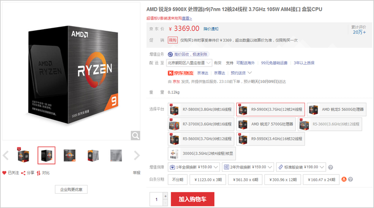 目前在AMD京東自營旗艦店,銳龍9 5900X這款處理器已降至3369元。筆者感覺這個價格已經(jīng)很不錯了,值得玩家們?nèi)胧帧?/p>