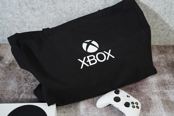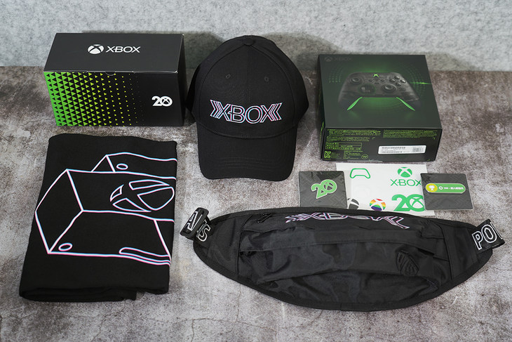 在帆布包中裝有XBOX 20周年紀念T恤、遮陽帽、斜挎包、口罩、貼紙、徽章以及XBOX 20周年限定版手柄。